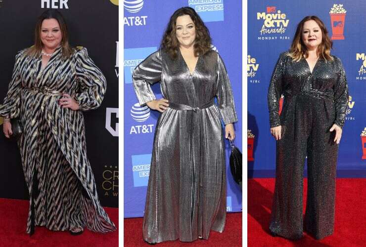 Ai Critics’ Choice Awards 2022, Melissa McCarthy ha proposto un abito a righe oblique che punta ad un effetto ottico, ma a catturare l’attenzione sono le calzature. L’attrice ha puntato alla comodità indossando sandali bassi. Al Palm Springs International Film Festival del 2019, ha proposto un long dress grigio fumo lucido di Daneh. A concludere il look una borsa in velluto di Tyler Ellis. Agli MTV Movie & TV Awards del 2019, la protagonista di God’s Favorite Idiot ha indossato un completo jumpsuit grigio scintillante, effetto metallico e rivestito di paillettes disegnato da Talbot Runhof.