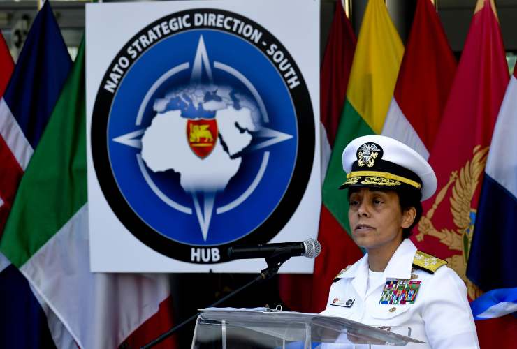 L’ammiraglio Michelle Howard, comandante delle Forze Alleate del Sud Europa, all’inaugurazione della Base della Nato al Lago Patria, in provincia di Napoli, nel 2017. Foto Ansa/Ciro Fusco