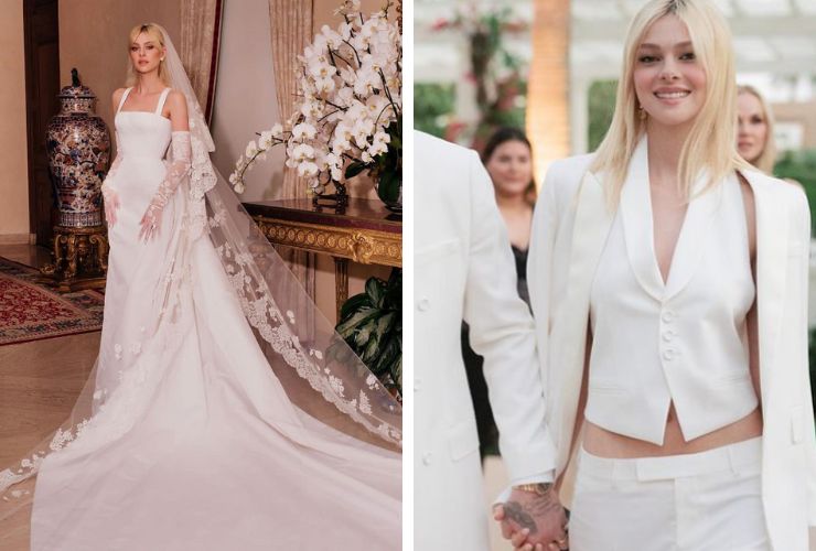 Un altro matrimonio animato da pettegolezzi al vetriolo è quello di Nicola Peltz e David Beckham. L’attrice, anziché indossare un abito da sposa forgiato dalla cognata Victoria Beckham, ha preferito affidarsi a Valentino, che le ha confezionato un abito romantico dallo strascico imponente e ricami floreali in pizzo. Ma, per il post-cerimonia, la bella sposa si è concessa tre cambi look firmati Versace: il più glamour è il tailleur total white.