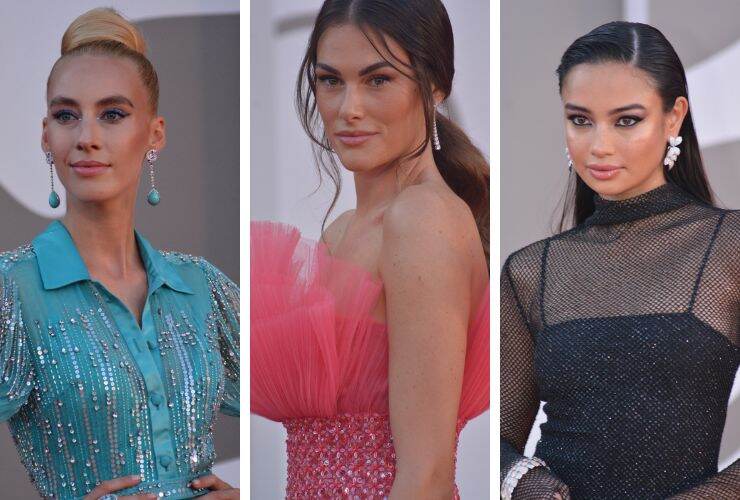 Magda Swider ha sfoggiato un look turchese sul red carpet di Venezia 2022, richiamato anche lato make-up con l’applicazione di strass che ravvivano l’inner corner. La modella ha raccolto i lunghi capelli biondi in uno chignon che gioca con le altezze. Anche Kelsey Merritt ha seguito la scia del wet look, mentre lato make-up ha puntato ad un effetto glow grazie alle labbra lucide e all’ombretto glitter.