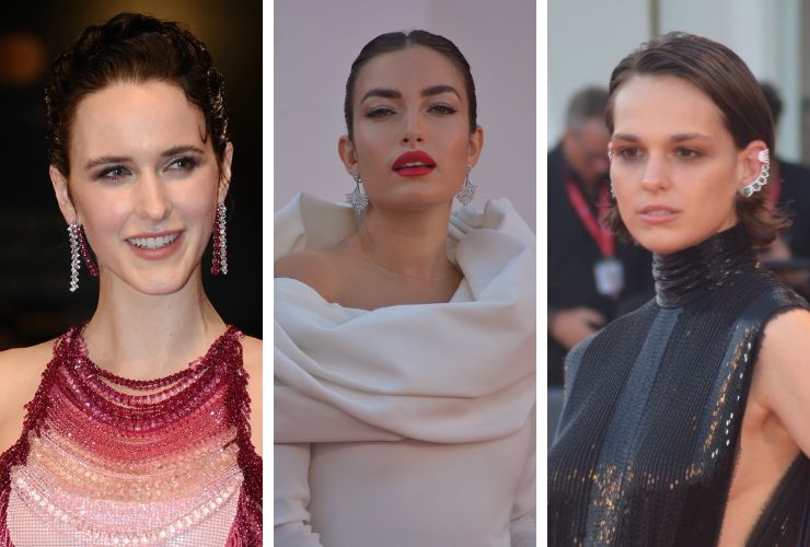 Sara Serraiocco rilancia il fascino del bob cut effetto wet con le punte arricciate verso l’alto e ciuffo laterale. Lato make-up, ha scelto uno smokey eye che avvolge l’intero occhio con sfumature bronzo e d’oro che richiamano l’abito. Nilufar Addati lascia che siano le labbra a guidare il suo beauty look, evidenziate da un rosso fiamma. Sopracciglia pettinate verso l’alto e uno chignon rigido completano il look. Rachel Brosnahan segue la tendenza del wet look a Venezia 2022 raccogliendo i capelli in uno chignon mosso. L’attrice richiama i colori rosati dell’abito nella scelta dell’ombretto, mentre le labbra puntano ad un effetto pesca simile al blush sulle guance.