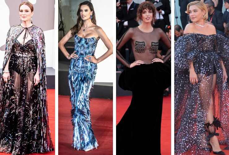 Alessandra Ambrosio è tra le più colorate di questa edizione. Sul red carpet ha sfoggiato dapprima un look total pink, ma il più glamour gioca con le sfumature del mare ed è ravvivato da frange e paillettes. L’abito, senza spalline, è di Alberta Ferretti. Julianne Moore, così come Florence Pugh, ha ben pensato di ravvivare il red carpet con un look sparkling ravvivato da trasparenze. Entrambi i look portano la firma di Valentino. Greta Ferro invece segue il trend dell’effetto nude, con un abito di Giorgio Armani.