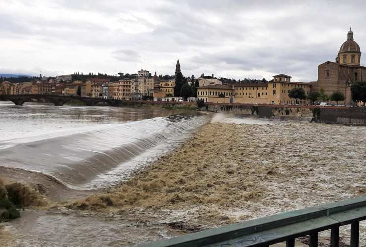 L’Arno gonfio dell’acqua delle piogge a Firenze. Foto Ansa/Michele Giuntini