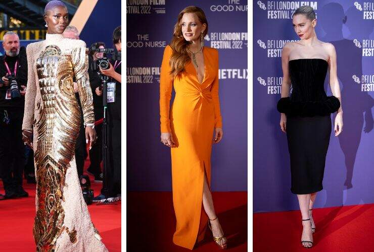 Splendidamente glamour Jessica Chastain sul tappeto rosso del BFI London Film Festival, con indosso un long dress di Roland Mouret a cui ha abbinato gioielli Gucci. Vanessa Kirby ha optato per un tubino total black senza spalline di Schiaparelli, mentre Jodie Turner-Smith osa con un abito armatura di Balmain.
