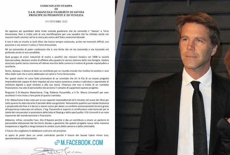 Per esporre la propria idea, il principe Emanuele Filiberto ha rilasciato un lungo comunicato. L’erede della storica casata ha affermato che i fatti recenti rappresentano non “solo un insulto ai tanti tifosi, che hanno sempre sostenuto, anche nei momenti difficili, con amore e passione il calcio a Torre Annunziata“, ma anche una “ferita che mi sta lacerando e sta toccando nel profondo anche la mia sensibilità“. La situazione delicata, dunque, ha fatto sentire il principe in dovere di dare un contributo per risollevare il Savoia Calcio e tutta la sua tifoseria.