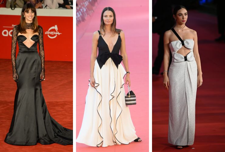 Difficilmente Benedetta Porcaroli manca il bersaglio. L’attrice sta scalando rapidamente la vetta e rappresenta la nuova generazione del mondo dello spettacolo insieme ad altre colleghe come Matilda De Angelis, a sua volta presente alla Festa del Cinema di Roma. La Porcaroli ha proposto un look total black rigorosamente Gucci, maison alla quale è particolarmente affezionata. Il suo long dress in raso presenta un corpetto dal taglio geometrico e scollo a forma di petalo, accompagnato da maniche e collo alto ricamato in pizzo. La De Angelis, invece, ha proposto un abito in avorio di Giorgio Armani, con corpetto composto da fiocchi in rilievo e accompagnato da gioielli Tiffany&Co.
