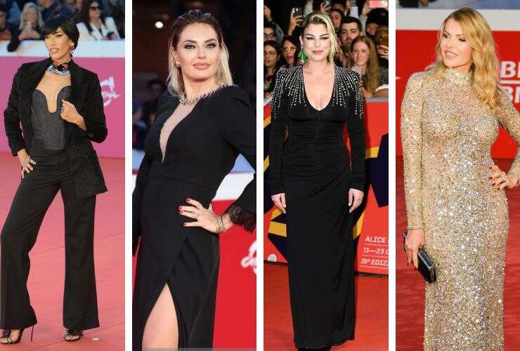 Di un’eleganza classica il long dress total black a maniche lunghe indossato da Manila Nazzaro, con spacco della gonna e scollo a V, firmato Floriana Formisano. Anche Emma Marrone ha calcato il tappeto rosso della Festa del Cinema di Roma, indossando un long dress total black con corpetto tempestato di strass e scollo a V di Gucci. Infine Rita Rusic ha optato per un long dress sparkling, in oro e rivestito di paillettes d’argento.