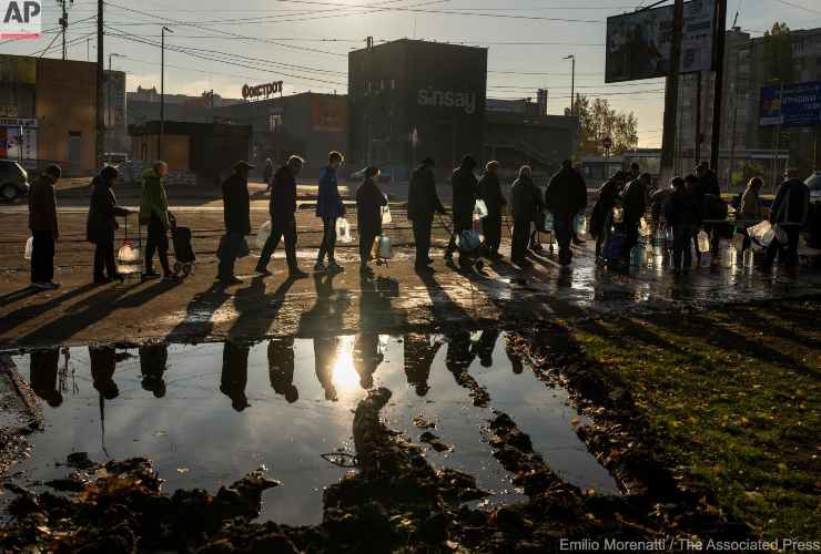 Persone in fila per prendere acqua potabile da un serbatoio nel centro di Mykolaiv, 24 ottobre 2022. Da metà aprile, i cittadini di Mykolaiv vivono senza un approvvigionamento centralizzato di acqua potabile. Le forze russe hanno danneggiato l’acquedotto attraverso il quale la città ha ricevuto l’acqua negli ultimi 40 anni. Foto Twitter @EmilioMorenatti