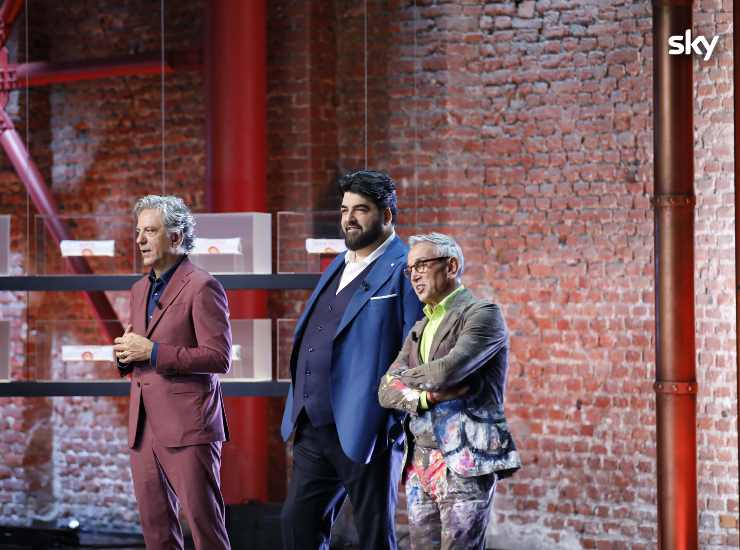 (Da sinistra) Giorgio Locatelli, Antonino Cannavacciuolo e Bruno Barbieri al timone di MasterChef Italia 12 (Sky Courtesy Press Office) – VelvetMag