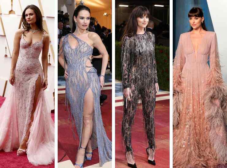 Restando in tema Oscar, un’altra attrice che ha avuto occasione di brillare nel corso dell’anno è Lily James. Per gli Academy Awards 2022, l’attrice di Pam&Tommy ha indossato una creazione romantica, un abito rosa pastello con ricami in pizzo e leggero strascico di Atelier Versace Couture a cui ha abbinato sandali con plateau in raso ton sur ton. Ed è della stessa maison l’abito gioiello indossato sul red carpet del Met Gala 2022. Lily James ha giocato con le trasparenze, optando per un abito lilla rivestito di perline e con profondo scollo lato schiena.