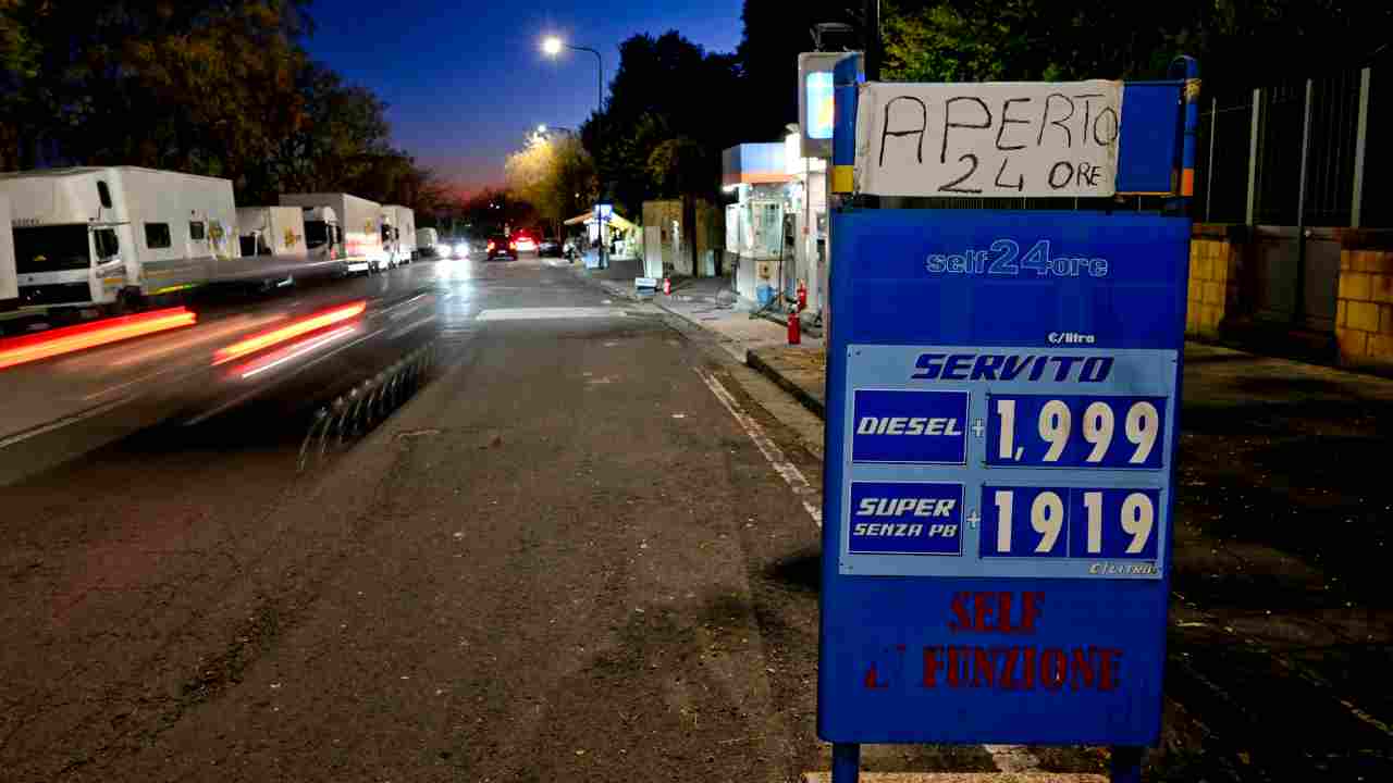 Un distributore di carburanti a Napoli. I prezzi esposti mostrano come un litro di diesel e super tocca quasi la soglia dei 2 euro, Foto Ansa/Ciro Fusco