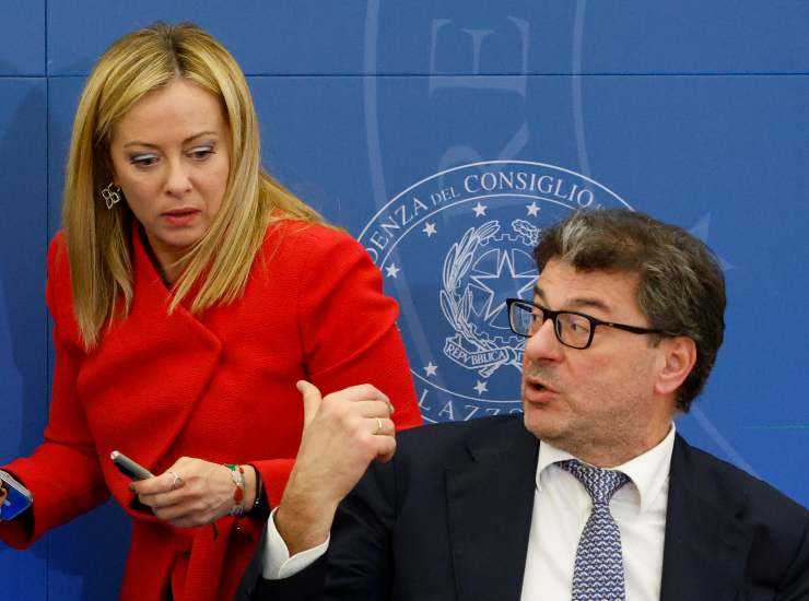 Giorgia Meloni con il ministro dell’Economia, Giancarlo Giorgetti. Il Governo chiede alla Finanza di intensificare i controlli contro le speculazioni sui prezzi della benzina. Foto Ansa/ Fabio Frustaci