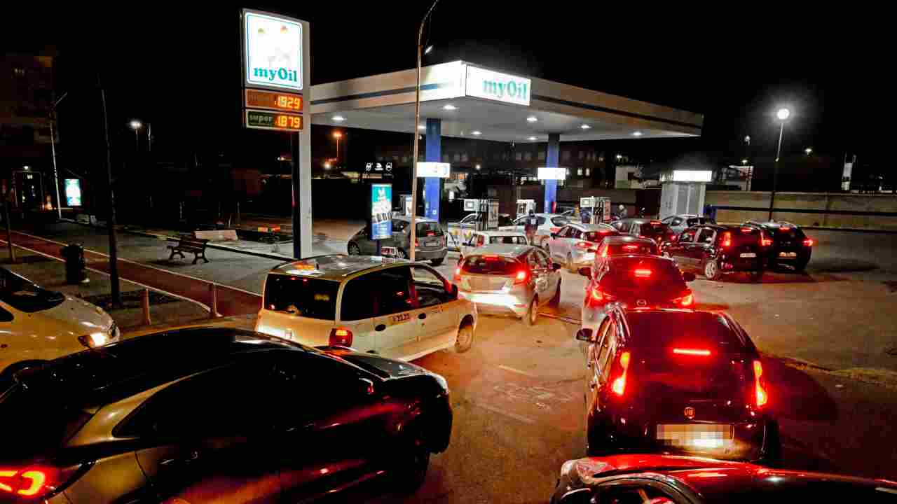 Automobili in fila a un distributore di carburante a Napoli. Foto Ansa/Ciro Fusco