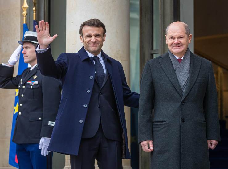 Emmanuel Macron (a sinistra) col cancelliere tedesco Olaf Scholz a Parigi il 22 gennaio 2023. Foto Ansa/Epa Christophe Petit Tesson