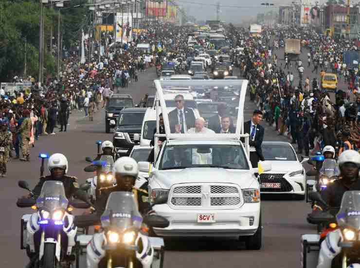 La papamobile per le strade di Kinshasa, capitale del Congo, il 31 gennaio 2023. Foto Vatican Media