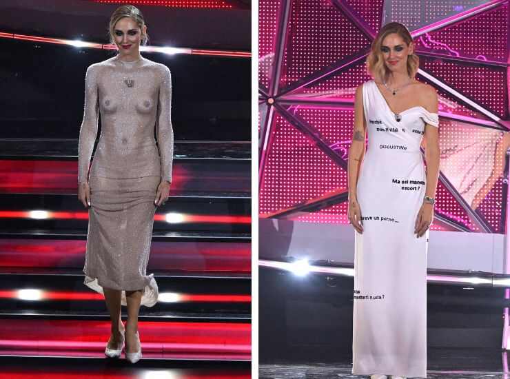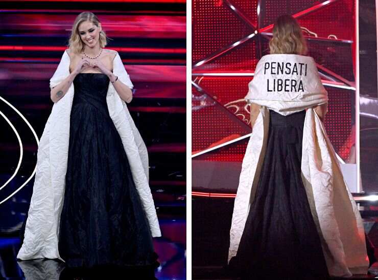 Sul palco dell’Ariston, Chiara Ferragni ha fatto il suo debutto di spalle, con una mantella che recita la scritta: “Pensati libera“, diventata virale in pochi minuti sul web. Parole tratte da Claire Fontaine, femminista, e piaciute subito a Chiara Ferragni tanto da diventare parte di un’opera fashion, o meglio di un vestito manifesto come l’ha definito l’influencer. Ogni abito si fa portatore di un messaggio caro all’imprenditrice digitale.