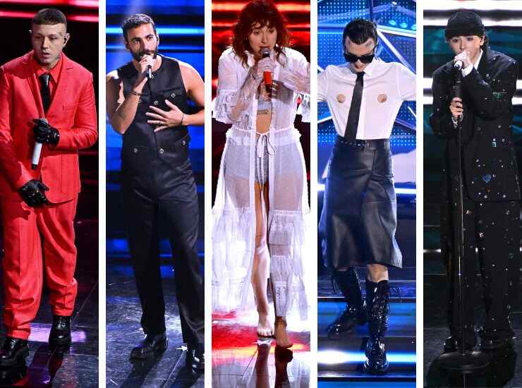 Lazza è arrivato secondo sul podio e, per la serata finale di Sanremo, ha optato per un completo rosso corallo in pelle con cravatta total black in pendant con i guanti di Missoni. Marco Mengoni invece ha proposto un completo in raso nero con bottoni in oro di Atelier Versace. Madame rispolvera il total white con un abito chemisier con pois, rouches e pizzo, aperto sul davanti e da cui spicca un completo due pezzi argentato con paillettes di Off-White. Rosa Chemical ha stravolto l’Ariston con un bacio a Fedez e, per la sua ultima esibizione a Sanremo 2023, ha optato per una gonna a vita alta in pelle total black, camicia cut out e cravatta di Moschino. Ariete è fierissima del suo completo genderless total black decorato con pezzi di dischi a forma di cuori di Marni.