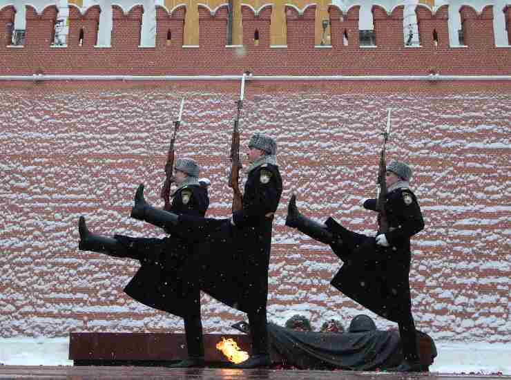 Militari russi della guardia d’onore marciano davanti alla Tomba del Milite Ignoto di fronte al muro del Cremlino al Giardino di Alessandro a Mosca in Russia. La mobilitazione militare contro l’Ucraina è sempre più massiccia. Foto Ansa/Epa Maxim, Shipenkov