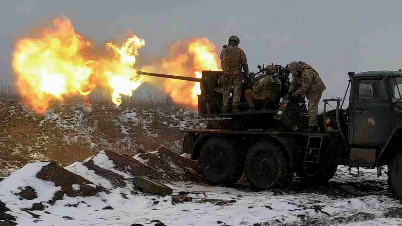 Soldati ucraini sparano con un cannone antiaereo presso Bakhmut, nel Donetsk, in Ucraina orientale. Foto Ansa/Epa Sergey Shestak