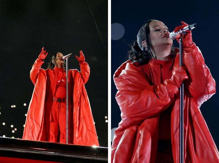 Rihanna non ha deluso le aspettative. Da tempo, infatti, il suo nome è stato associato a quello del Super Bowl e ha regalato perfette vibes all’halftime show. Sul palcoscenico, in dolce attesa, la cantante ha sfoggiato un completo jumpsuit total red di Loewe personalizzato accompagnato da bomber ton sur ton e guanti in pelle. A rendere speciale l’abito personalizzato è il fatto che è stato “progettato per aumentare il volume al passo con la scenografia dinamica dello spettacolo”. Come riporta People, il direttore creativo del brand Jonathan Anderson ha lavorato accuratamente alla tuta in jersey di Rihanna costruendola sul suo look. Ha quindi realizzato un corsetto in pelle scolpito che evidenzia il pancione della gravidanza. Ha poi completato con una tuta a strati realizzata in tela di cotone.