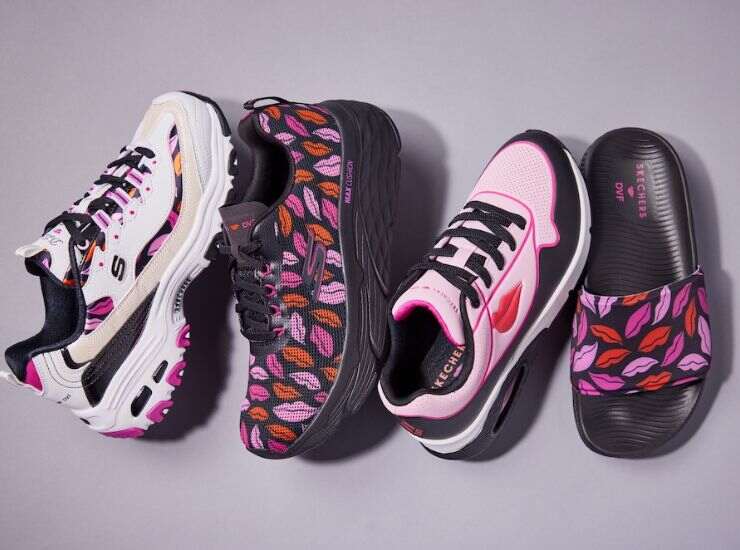 Si parte dai modelli sneaker, come Skechers x DVF UNO – BESO. Tra i più famosi del brand, si adatta al bacio di Diane Von Furstenberg e alle sue sfumature tenui, con una tomaia in colour-block nero e rosa. Il secondo modello della capsule collection è il D’Lites – Red Slip, best seller dagli Anni ’90 diventato ormai un marchio di fabbrica per il brand presentato in veste pop con una stampa a bacio e colori brillanti. Ultimo paio di sneaker è il Max Cushioning Elite – Multi Kiss, scarpa sportiva completamente rivestita dalle labbra di Diane Von Furstenberg.