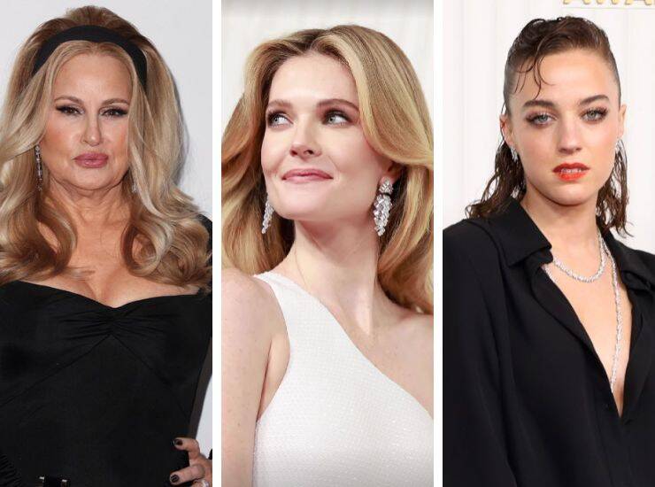 Jennifer Coolidge ha scelto un’altra acconciatura dalle vibes vintage, con maxi fascia total black che rende la piega più voluminosa. Ma la vera chicca glam è la manicure cromatica. Anche Beatrice Grannò di The White Lotus ha rilanciato il fascino del wet look (dopo il successo ottenuto a Sanremo 2023, pare che sia un fascino tutto italiano). Meghann Fahy invece ha proposto un beauty look semplice e romantico che richiama l’avorio dell’abito, con labbra rosa confetto e piega leggermente mossa.