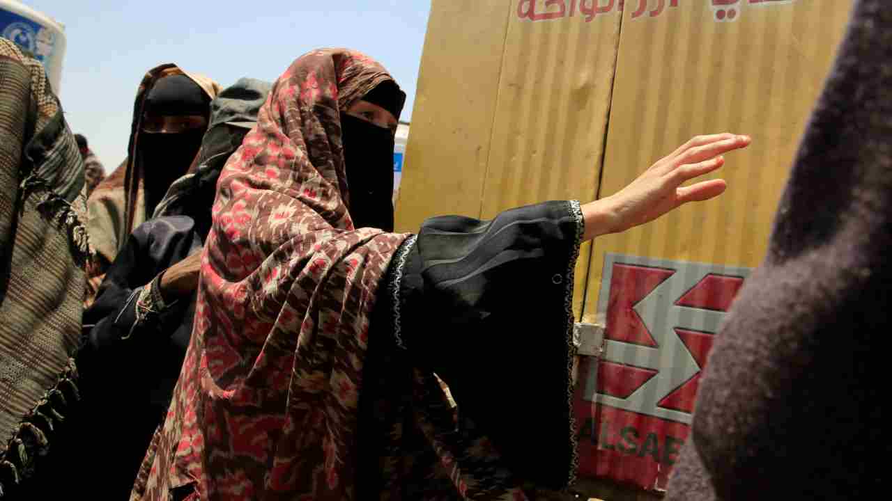 Donne in coda per ricevere aiuti umanitari donati dall’Unicef in un campo per sfollati interni (IDP) alla periferia di Sana’a, Yemen. Foto Ansa/Epa Yahya Arhab