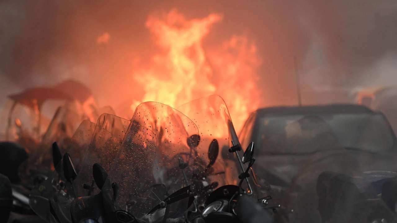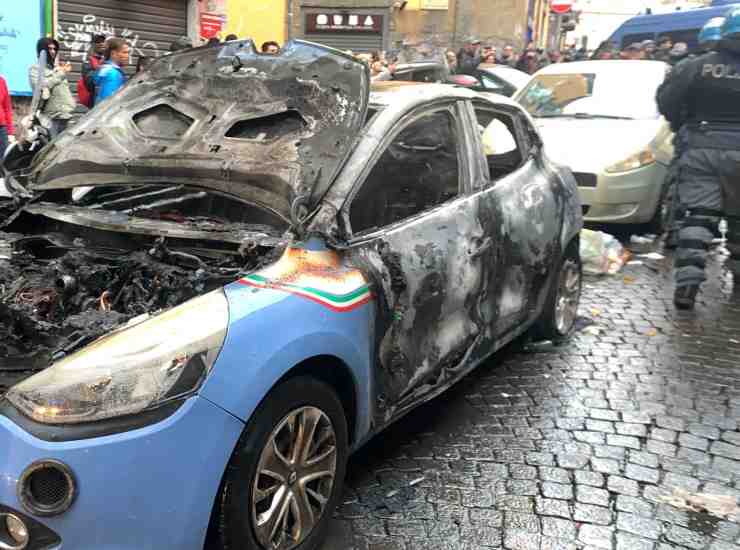 Durante la vera e propria guerriglia urbana che si è verificata a Napoli un’auto della polizia è stata data alle fiamme. Foto Twitter @ciropellegrino