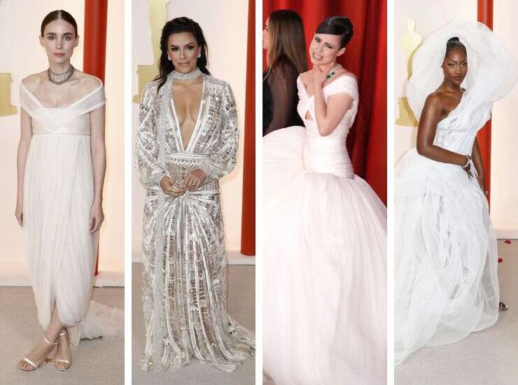 Il look total white può essere anche vintage, come dimostra Rooney Mara. Sul red carpet degli Oscar 2023 in un midi in chiffon con corpetto intrecciato e strascico legato di Alexander McQueen. E poi c’è chi, come Eva Longoria, ha indossato un abito gioiello che rincorre trasparenze e strass luminosi, in un gioco di luci di Zuhair Murad Couture. Romantico, da fiaba, l’abito in chiffon total white con gonna a campana di Sofia Carson, una creazione di Giambattista Valli. Un abito che ha fatto parlare di sé è quello indossato da Tems, una trama increspata di Lever Couture.