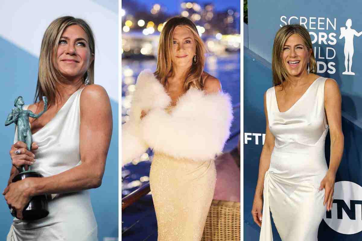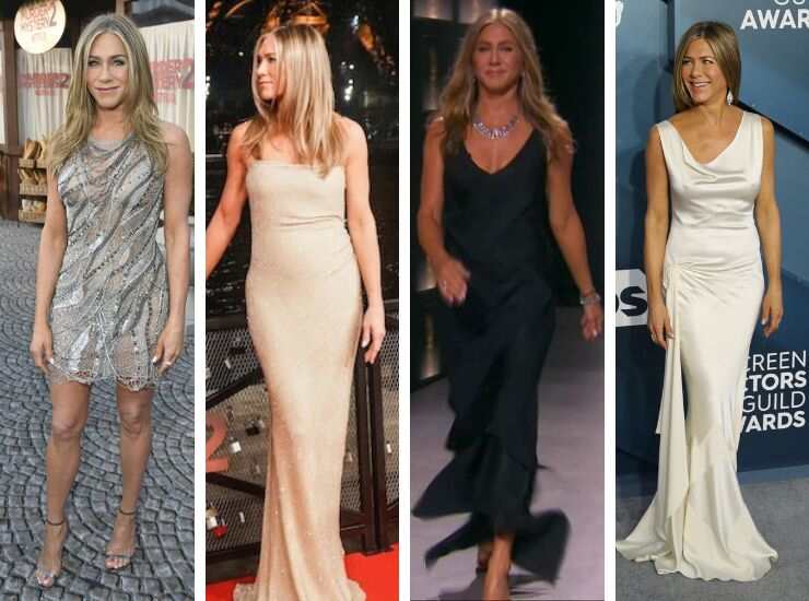 Luminoso l’abito champagne tempestato di glitter con spalline ultra sottili indossato alla première dello stesso film, ma a Parigi. Per l’occasione, Jennifer Aniston ha scelto una creazione glam di Celine by Hedi Slimane. Sul red carpet degli Emmy Awards 2020, invece, ha proposto la semplicità con un long dress nero con scollo a V di John Galliano per Christian Dior, un abito vintage accompagnato da collier di Neil Lane. Quell’anno, Jennifer Aniston ha partecipato anche ai SAG Awards e, sul tappeto rosso, ha scelto un altro abito avorio di Christian Dior by John Galliano.
