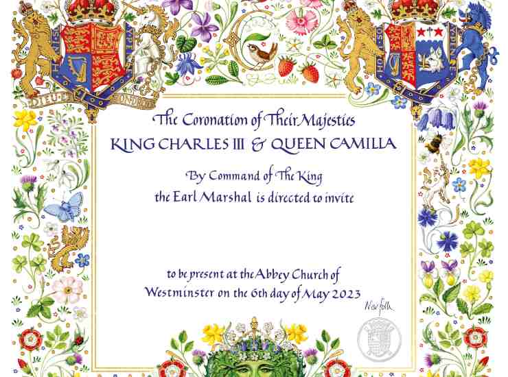 Anche se gli utenti del web non se ne renderanno mai conto, chi riceverà l’invito cartaceo noterà subito il primo importante cenno alle battaglie di Carlo III. L’invito, dipinto a mano con la tecnica dell’acquarello, sarà realizzato su carta riciclata, con un richiamo all’interesse del re per la sostenibilità e il rispetto dell’ambiente. Al centro dell’invito il messaggio è molto semplice. Vi si legge: “L’incoronazione delle loro maestà il re Carlo III e la regina Camilla. Per comando del re e del conte maresciallo (il nome dell’invitato, n.d.r.) è invitato a essere presente presso la chiesa abbaziale di Westminster il 6 maggio 2023“.