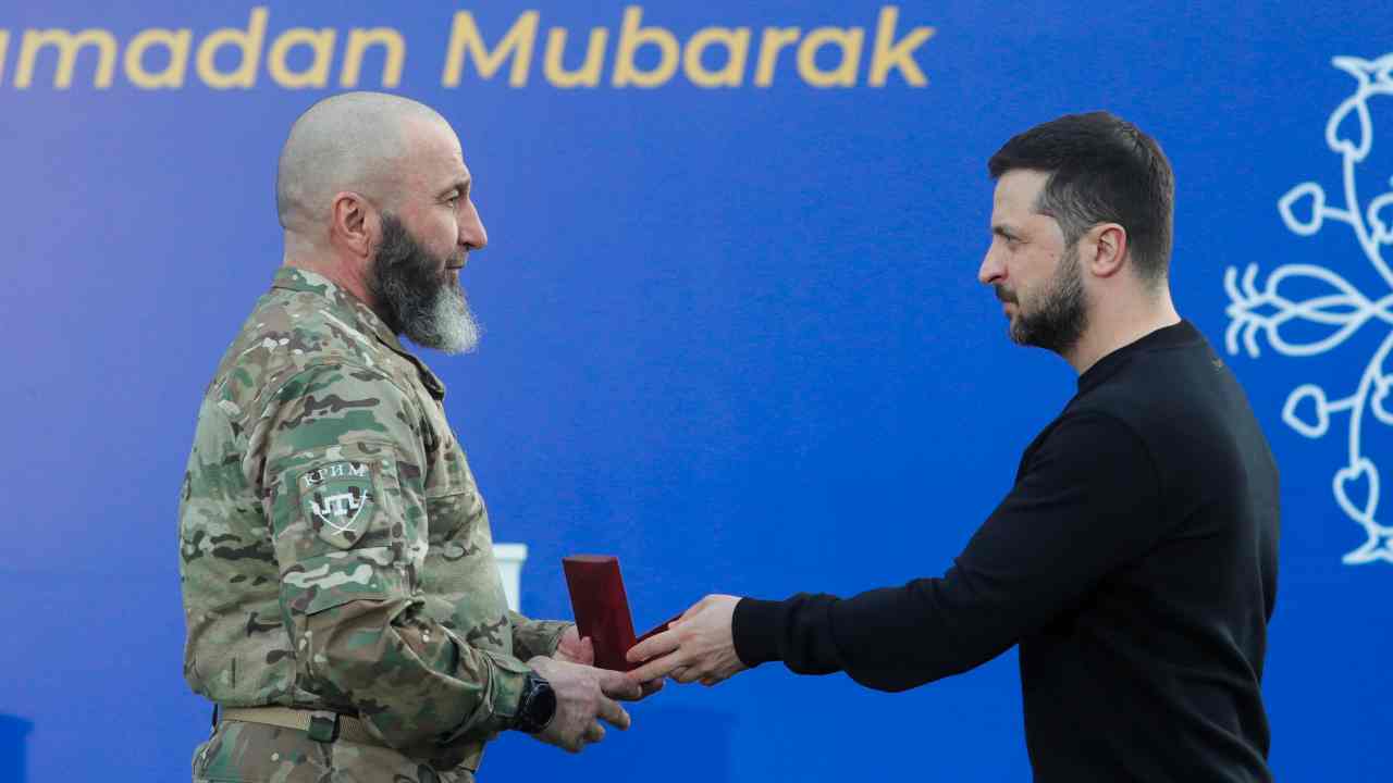 A destra, il presidente ucraino Volodymyr Zelensky. Foto Ansa/Epa Sergey Dolzhenko