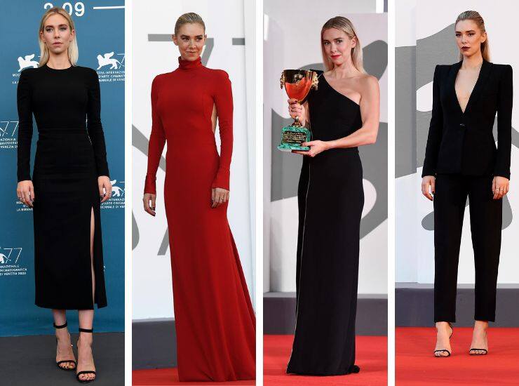 Anche il 2020 ha permesso a Vanessa Kirby di sfilare sul red carpet della Mostra del Cinema di Venezia, questa volta per presentare Pieces of a Woman. Al photocall, ha scelto un long dress total black di Valentino. Poco dopo, sul red carpet, ha proposto un cut out dress rosso ciliegia di Valentino Haute Couture. Durante la cerimonia, l’attrice si è concessa anche un altro red carpet, scegliendo un tailleur total black con spalline a punta di Giorgio Armani. In vista della serata di cerimonia, Vanessa Kirby (vincitrice) ha scelto un long dress monospalla di Giorgio Armani in velluto.