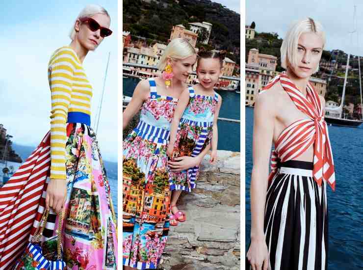 La loro è una partnership che procede ormai da sette anni. Per la linea Portofino si respira un’aria più vintage, si torna agli Anni ’50 con un’atmosfera suggestiva accompagnata dalle note di Davide Locatelli e colori sgargianti, dal blu all’arancione effetto corallo. Si tratta di una collezione bambina e donna, che abbraccia l’estetica senza tempo della maison e rende omaggio ad una delle mete estive più belle d’Italia. I suoi abiti sono un vero e proprio richiamo alle bellezze di Portofino, come le bellissime case colorate, il suo porticciolo e la piazzetta dove ha preso vita la sfilata. Per la collezione in partnership con Mytheresa, la maison ha realizzato capi prêt-à-porter. Non si rinuncia a set coordinati, abiti e tute con accessori glam per l’estate. Le righe diventano un must di stagione per Dolce&Gabbana, con la sua sfumatura mare da abbinare anche a minigonne o short in denim.