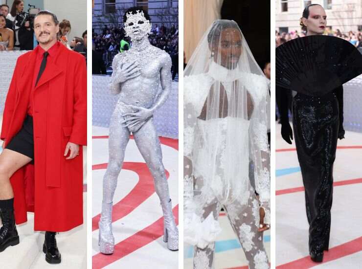 Non potremmo definirlo bizzarro né stravagante, ma sicuramente ammaliante il look proposto da Pedro Pascal, con un long coat rosso ciliegia abbinato a short e cravatta total black di Valentino. Lil Nas X invece ha trasformato il suo corpo in un gioiello, rivestendo la pelle di uno strato silver glitter a cui ha applicato perle di varie dimensioni. Il suo look è Dior. Alton Mason ha optato per un look in pizzo bianco di Karl Lagerfeld con velo drammatico. Infine Jordan Roth ha tramutato il suo abito in un maxi ventaglio total black di Schiaparelli.