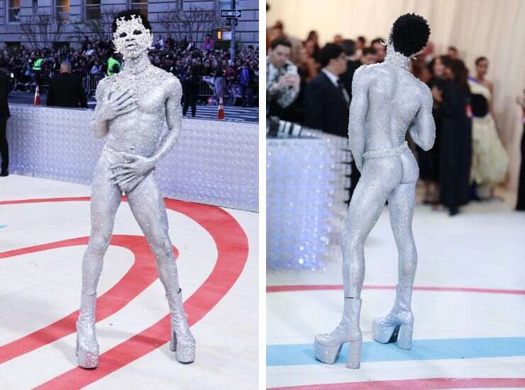 Il cantante si è concesso un body painting sparkling, lasciando soltanto pochissime aree del corpo privo di tocco silver. Non è la prima volta che Lil Nas X gioca con il suo stile, proponendo look audaci. Ma quello sfoggiato al Met Gala è forse il più eccentrico realizzato finora. Come riporta Vogue, il team beauty ha lavorato nove ore per applicare uno dopo l’altro strass e perle sul suo corpo, avvolto dalla luminosità dei cristalli Swarovski.