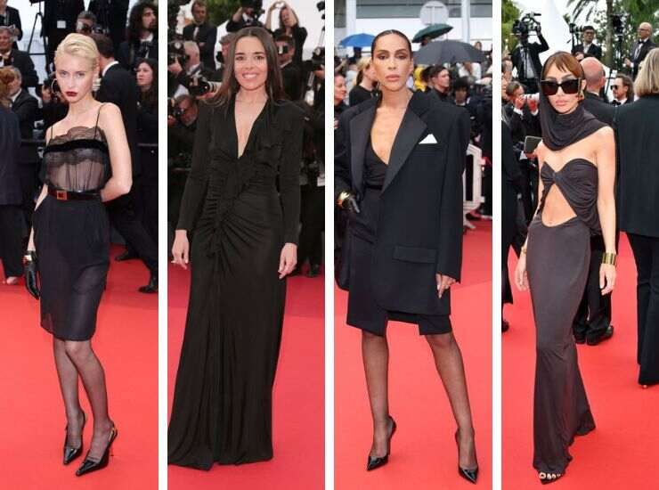 Anche il look proposto da Iris Law oltre ad essere total black è firmato da Saint Laurent. La modella ha optato per un naked look, un minidress in chiffon con delicati ricami in pizzo e cintura ad altezza vita. Elodie Bouchez ha scelto un abito drappeggiato della maison francese, rigorosamente nero, mentre Ines Rau ha abbinato al suo slip dress un blazer in tinta. Nadi Lee Cohen ha sfoggiato un cut out dress grigio fumo senza spalline della maison.