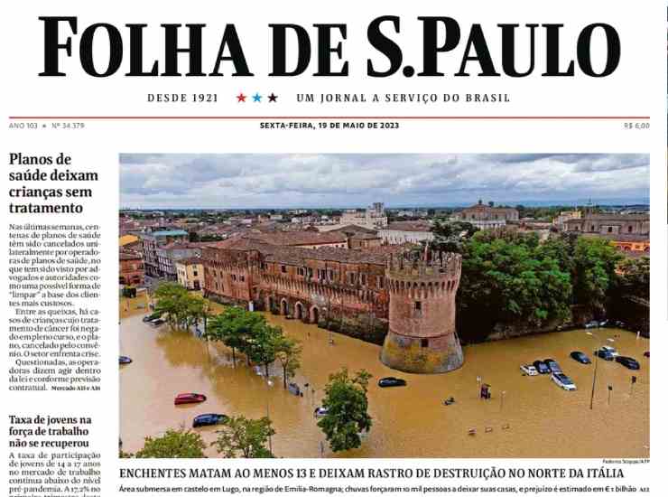 La prima pagina del quotidiano Folha de S. Paulo, di San Paolo del Brasile, la cui apertura è sull’alluvione in Emilia Romagna. Foto Twitter @ROBZIK