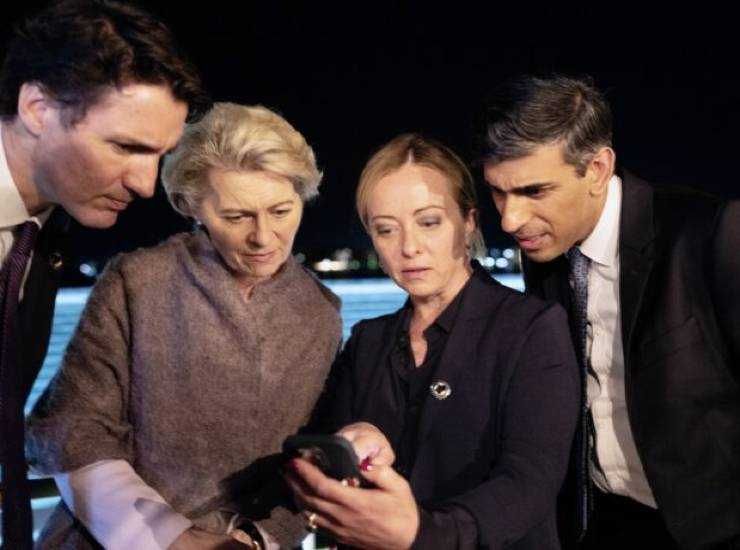 La premier Meloni mostra le immagini dell’alluvione in Romagna a Trudeau (Canada), von der Leyen (Ue), e Sunak (Uk). Foto Twitter @dariodangelo91