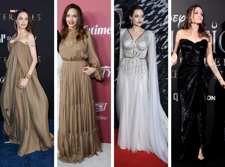 Alla première di Los Angeles dello stesso film Marvel, ha optato per un abito in raso con scollo a cuore, di una sfumatura delicata di marrone, firmato Balmain Resort 2022. All’evento Variety’s Power Of Women, Angelina Jolie ha partecipato con sua figlia Zahara, proponendo una sfumatura di colore molto simile alla precedente, con un abito a balze e plissé di Harith Hashim. Maestoso è l’abito bianco in chiffon tempestato di cristalli con mantella ton sur ton e lingue in oro proposto alla première di Maleficent: Signora del male a Londra nel 2019. Il long dress è firmato Ralph & Russo Couture. Per lo stesso film, è apparsa anche a Roma, con un abito nero con paillettes di Atelier Versace.