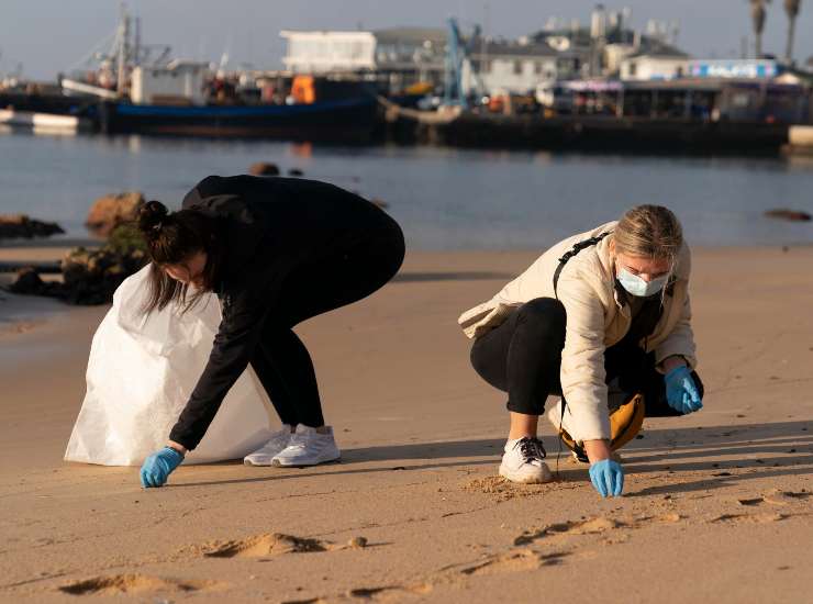 Volontari sudafricani raccolgono rifiuti di plastica. Foto Ansa/Epa Nic Bothma