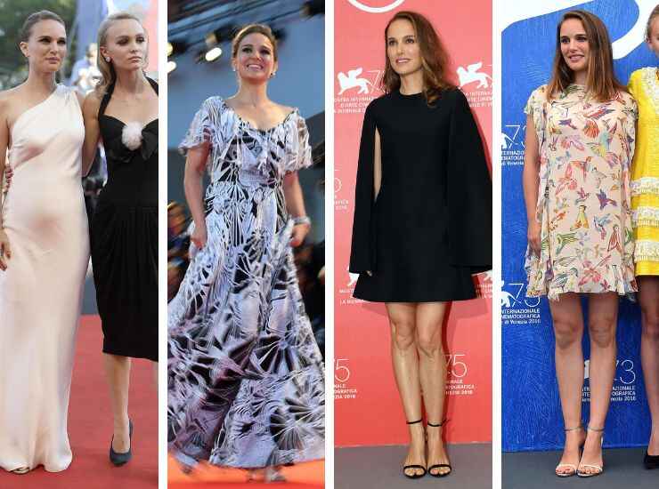 Per il photocall in quel di Venezia, sempre per l’edizione 2018, l’attrice ha optato per un abito total black, un minidress a maniche lunghe con mantella ton sur ton e sandali. Due anni prima, sempre in Laguna, Natalie Portman ha raggiunto il red carpet con un appena accennato rigonfiamento di gravidanza. Sul tappeto rosso della Mostra del Cinema di Venezia di allora, ha indossato un abito in raso color perla con dettaglio monospalla firmato Dior Couture. Black&white, a trama floreale, è invece l’abito proposto per la première di Jackie. Infine, poco prima di quel red carpet, per il photocall ha sfoggiato un minidress in raso ravvivato da farfalle colorate.
