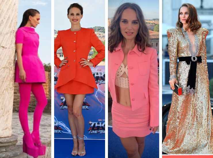 Anche per il photocall svoltosi a Roma durante l’estate 2022, Natalie Portman ha optato per un completo rosso fragola, con capelli raccolti in uno chignon elegante. Cambio look sempre in quel di Roma, con un completo rosa pesca e crop top all’uncinetto firmato da Miu Miu. L’ultima volta che Natalie Portman si è concessa una tappa italiana risale al 2018. L’attrice ha sfilato sul red carpet della Mostra del Cinema di Venezia indossando un long dress rivestito di paillettes in oro, con scollatura tempestata di strass d’argento e maxi cintura in velluto. Il suo look porta la firma di Gucci.