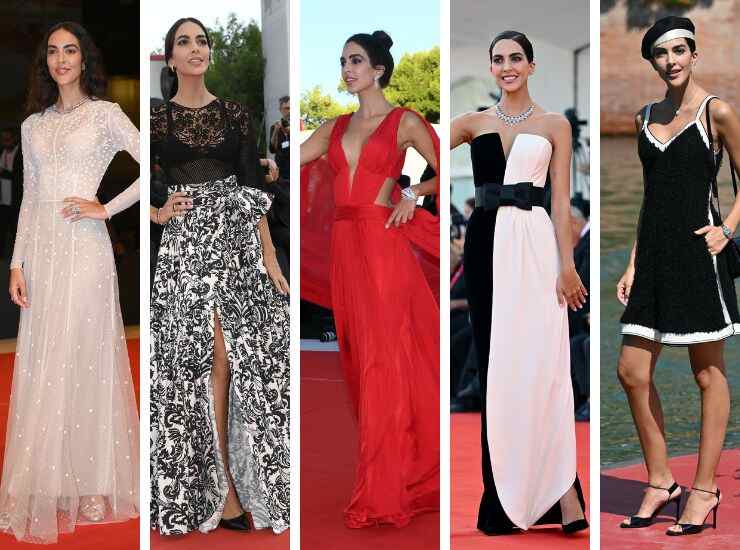 Cascata di paillettes e dettagli cut out invece per la première di Chiara, un abito firmato Del Core. Per Dead for a Dollar, invece, ha scelto un look nude con delicati ricami floreali di Philosophy di Lorenzo Serafini, impreziosito da gioielli Cartier. Rocío Muñoz Morales ha approvato il look black&white floreale per il red carpet di Argentina 1985, firmato Dior. Di rosso vestita, con un abito vaporoso di Alberta Ferretti, invece per Bones and All. Ma il suo grande inizio come Madrina è in black&white. L’arrivo in laguna con minidress nero è Giorgio Armani.