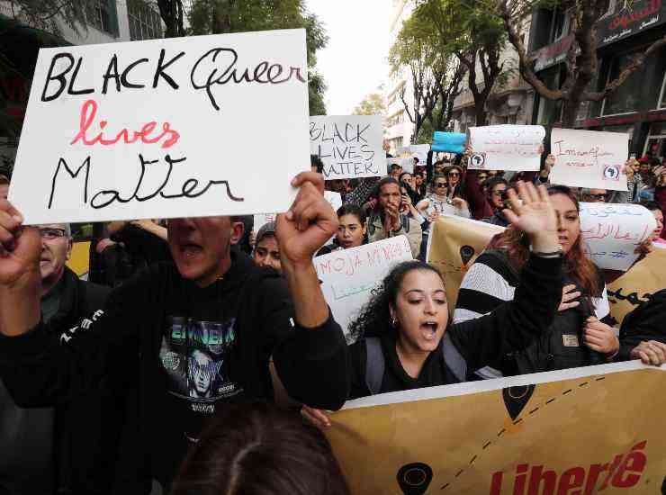 Una protesta dello scorso febbraio contro il presidente tunisino Kais Saied dopo la sua dichiarazione contro i migranti africani, secondo cui la loro presenza è stata una fonte di “violenza e crimini” a Tunisi. Foto Ansa/Epa Mohamed Messara
