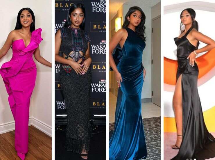 Sempre per Netflix, l’attrice ha optato per un abito magenta che è il colore Pantone del 2023. Il long dress fascia la silhouette, è in raso e con dettaglio monospalla e porta la firma di Rubin Singer. Ha raggiunto anche l’anteprima di Black Panther: Wakanda Forever e, per l’occasione, ha indossato un cut out dress di Etro a cui ha abbinato gioielli Levian. Blu cobalto ma rigorosamente in velluto è l’abito con leggero strascico firmato Greta Constantine. Alla première di Non ho mai per la terza stagione, invece, ha indossato un long dress in raso nero a cui ha abbinato sandali di Stuart Weitzman.