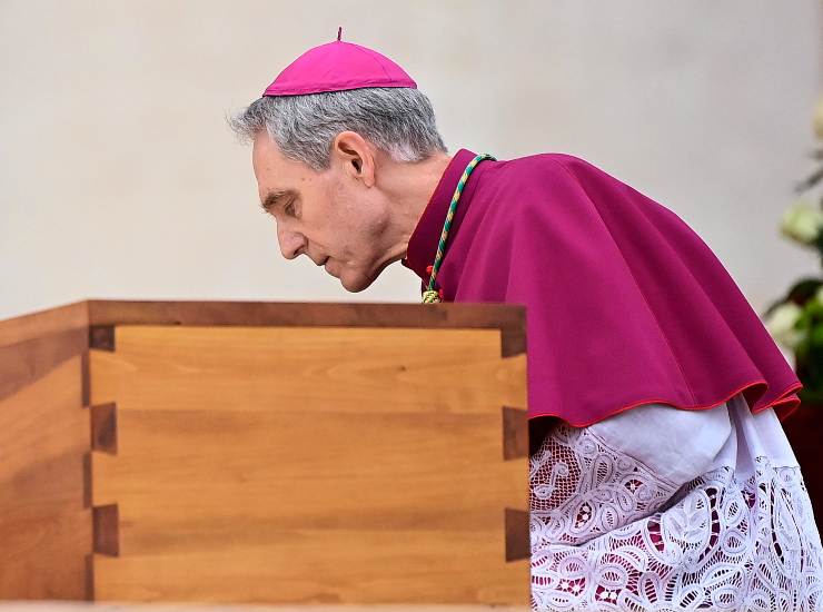 Padre Georg Ganswein accanto alla bara durante i funerali del Papa emerito Benedetto XVI il 5 gennaio 2023. Foto Ansa/Riccardo Antimiani