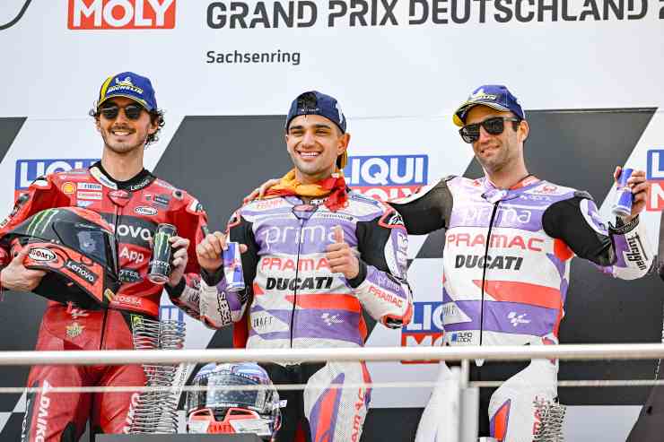 Grande furore Ducati al Moto GP di Germania. Tripletta sul podio: con Jorge Martin sul gradino più alto, Francesco Bagnaia al secondo posto e Johann Zarco che taglia il traguardo per terzo. E a seguire ancora due moto italiane, guidate da due italiani: Marco Bezzecchi e Luca Marini. Ottima prestazione per i due ‘discepoli’ di Valentino Rossi che, dopo la caduta di Brad Binder, si mettono avanti. A interrompere quello che sarebbe stato un ‘filotto’ Ducati e la KTM di Miller che arriva sesta, seguita da altre tre Desmosedici: Alex Marquez, Enea Bastianini e Fabio Di Giannantonio. Tutti protagonisti di una gara accesissima che ha tenuto l’adrenalina alta fino all’ultimo giro. Per le moto di Borgo Panigale si tratta di un altro Gran Premio da incorniciare dopo il tris al Mugello.