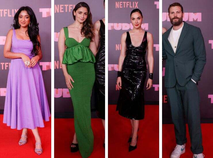Uno dei colori che più piace al 2023 è il lilla, che fa parte della macro famiglia del Barbiecore. Ed è il colore scelto da Maitreyi Ramakrishnan, protagonista di Non ho mai... su Netflix. Sul tappeto rosso di Tudum, ha optato per un midi lilla in raso di Stuad, a cui ha abbinato sandali ton sur ton di RODO. Alia Bhatt ha sfoggiato un long dress verde oliva a costine, con coda a sirena di Hervé Léger, a cui ha abbinato maxi plateau. Gal Gadot, invece, ha preferito un midi total black in lattice realizzato da Karla Welch. Vi ha abbinato semplici décolleté nere. Presente anche Jamie Dornan, sempre del cast di Heart of Stone, con un look color carta da zucchero e sneakers total white.