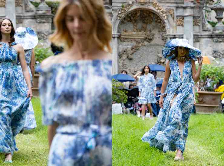 L’evento si è aperto con la musica live degli artisti di Mascarade Opera Studio, con un omaggio alla lirica nell’incantevole giardino Frescobaldi. Le note hanno accolto un gruppo di modelle per un giorno, donne di età diverse. In passerella per Luisa Beccaria ragazze italiane e straniere, madri e figlie, sorelle, amiche, giovani artiste, per un défilé con una cinquantina di abiti pensati per un bucolico garden party o per una giornata romantica e spensierata sulle spiagge della costa toscana. Materiali freschi e leggeri come georgette, organza, raso si impreziosiscono con ricami e lavorazioni a fil coupé. Tessuti che si inframmezzano a stampe floreali di ninfee, fiori sfumati e cotone che si intaglia in sangallo a foglie, con grafismi quasi marini. Il tulle è ricamato con fiori che ricordano la flessuosa anemone di mare.